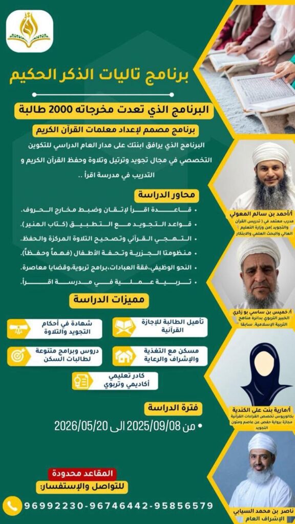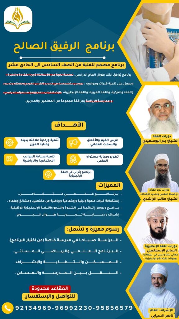 برنامج يرافق ابنك طوال العام الدراسي، بصحبة نخبة من الأساتذة ذوي الكفاءة والخبرة، ويعمل على تنمية قدراته ومواهبه، دروس متخصصة في تجويد القرآن الكريم وحفظه وتدبره، والفقه والتزكية، واللغة العربية، واللغة الإنجليزية، بالإضافة إلى دعم ورفع مستواه الدراسي، وممارسة الرياضة برفقة مجموعة من المعلمين والمدربين.